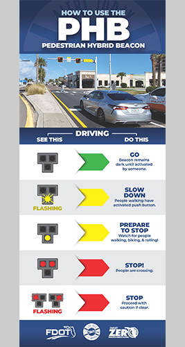 A Pedestrian Hybrid Beacon (PHB) is an overhead traffic device that resembles a regular traffic signal. It has two side-by-side red indicators above a single yellow indicator. But unlike a regular traffic signal, the signal face for drivers remains "dark" until the pedestrian activates the beacon. Because PHBs remain dark until activated, they can help increase driver attention to pedestrians crossing the roadway and can reduce rear-end collisions.